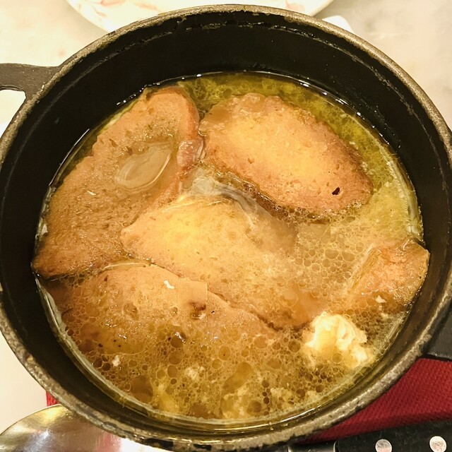 肉の出汁がしっかり。塩味が控えめであっさりしていました。フレンチオニオンスープとは全く違います。