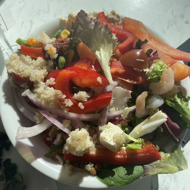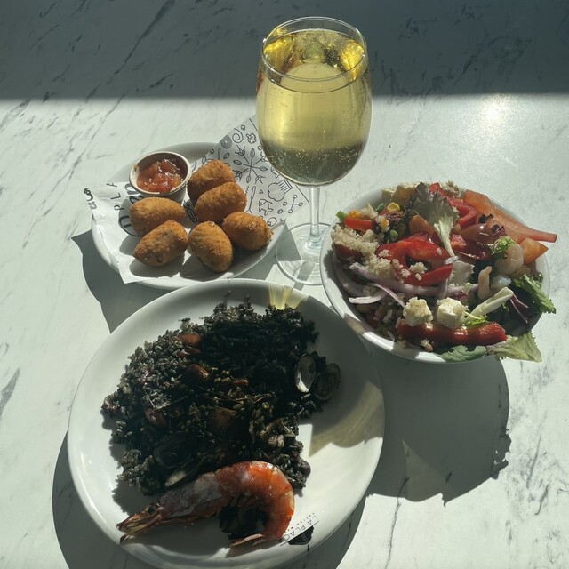 パスタのパエリアとサラダ。飲み物も自分で氷や量など調節出来ます。