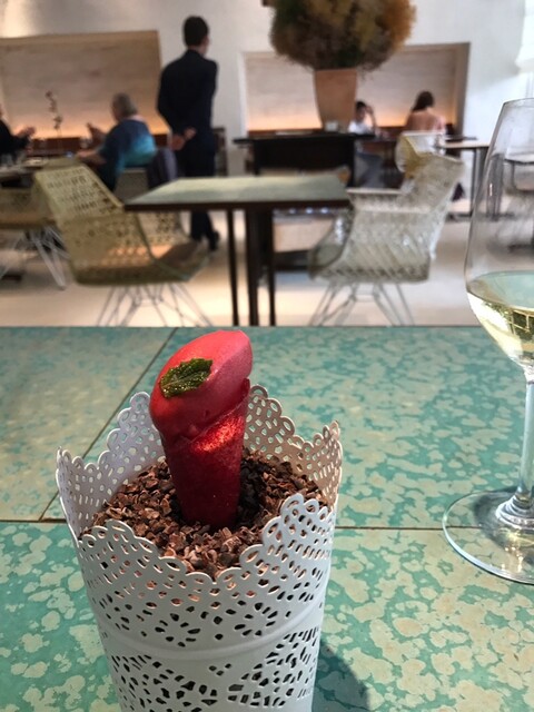 エルブジの分子ガストロミーを随所に散りばめ、正統派料理も組み込んで構成されるコース料理は時間の経つのを忘れる位、驚きと舌の上での喜びを感じさせてくれる。
