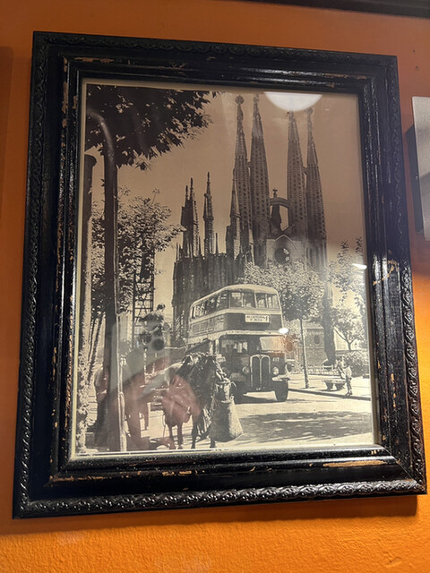 オレンジ色の壁に飾ってある白黒写真はバルセロナの昔の写真。