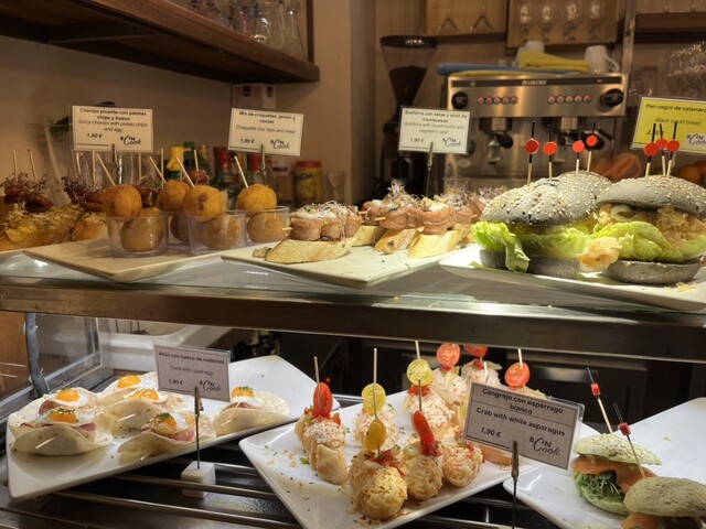 ピンチョス通りの1軒。並んでいるピンチョスを自分で皿にとり、飲み物を口頭で注文して席で食べるセルフ方式。
