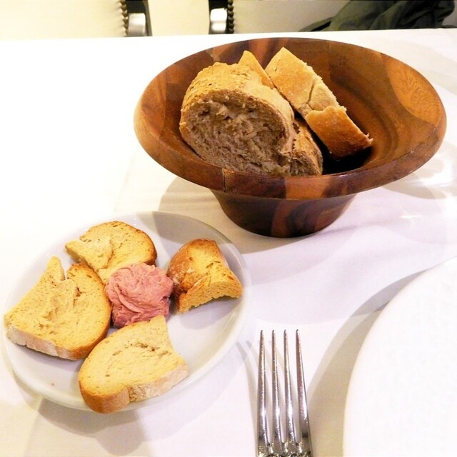 まだ注文もしてない段階で、まずは硬いパンとペーストが出てきました。ピンク色のペーストはたぶんレバーペーストだ...