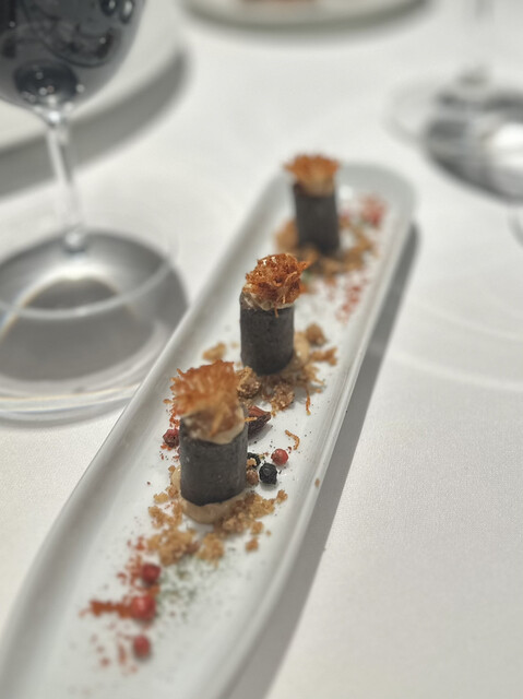5品のアミューズはどれも丁寧かつ繊細な調理を感じさせる料理ですね。特にブルーコーンという食材は南米食材なので地物食材ではありませんが初体験かもしれません。味で言えばニンニクポタージュがなかなか美味しい。一際目を引くのがカラビネロ海老という真っ赤な海老。非常に立派なサイズです。南フランス3つ星の「Baumanière」で同じものを食べましたが、それと比べるとちょっと火が通り過ぎでしょうか。南フランスの方に軍配です。低温加熱卵とマッシュルームのマーブルはとても濃厚でマッシュルームの香りが良く、私の好みにハマりました。鳩のローストも少々火入れが。もしかするとスペインはあまり生で食べる事が少ないのでしょうか。いやいや、でも周辺ヨーロッパで色々食べ歩きしましたが、それらと比べても火が通り過ぎている気がしました。ソースや味付け美味しいんですが、火入れは少し残念です。デザートは文句なし。小菓子は濃厚チョコレートで非常に満足度が高いですね♪ 日本人だとちょっと重たいと思う人もいるかもしれません。全体的には3つ星と聞くともう少し何かが欲しい。良いところと気になるところがそれぞれありましたが、バル巡りの最後にサンセバスチャンの高級店に訪問できた事は貴重な体験だったと思います。