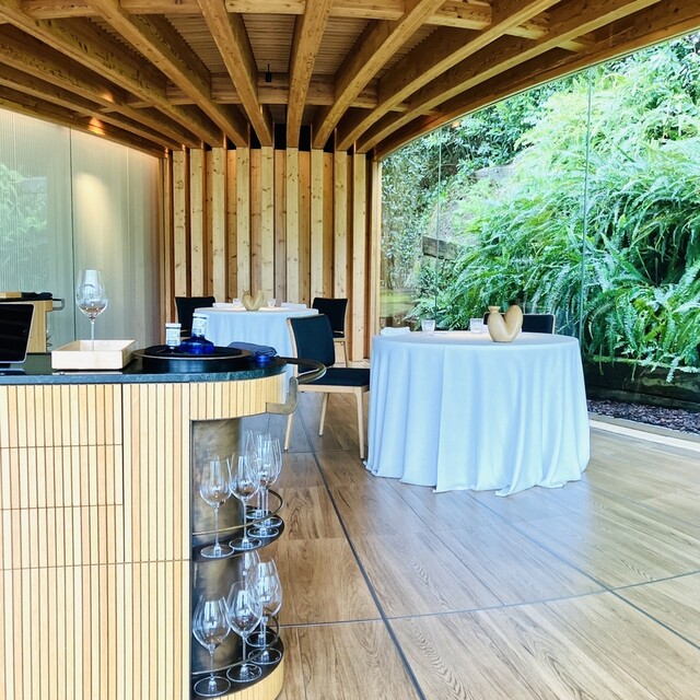大きな建物の入口には2025年のミシュランのプレートがありました。案内されたガラス張りのホールのテーブル数は少なく、外には庭と向かいの丘の緑が見えます。