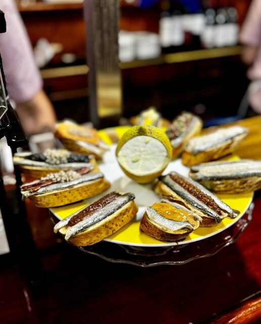 塩漬けのシンプルなもの(奥)と、酢漬けに黒オリーブを乗せたもの(手前)。 特に、オリーブのヤツはサンセバスチャン行ったらマストですね(^^) また、パンの乾燥具合が絶妙なのだ。
