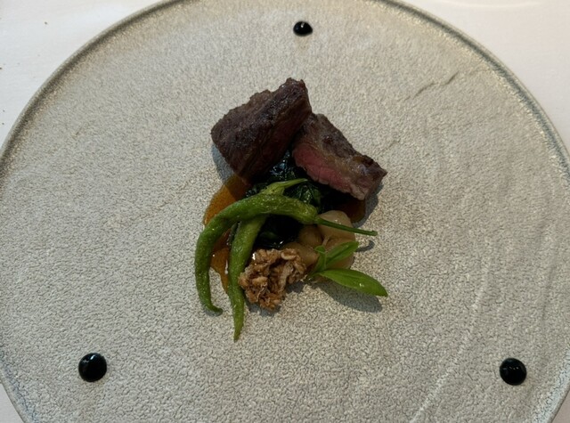 コースで特に印象に残ったのは、季節のお魚(マグロ)のグリルで火入れ(中心部はレア)の巧みさ、ムール貝のペーストの美味さ、日本食材を上手く取り入れた味付けの上手さですかね。肩ロース肉のステーキのソースは、日本の「焼肉のタレ」のニュアンスで、少々びっくりw