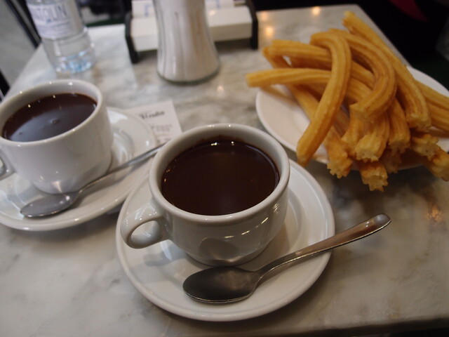 マドリードに行ったら必ず行こうと思っていたチュロスの老舗で、日本でなじみの細いチュロスのほか、手焼きちくわ並みの太いチュロスもあり、両方注文してみました。