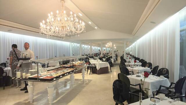 1階の朝食会場に向かうと白を基調とした造りとシャンゼリア