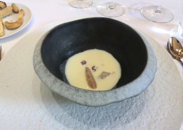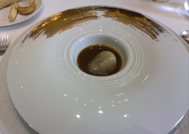 前庭のアペリティフルームで6種のアミューズ。館に入り、窓越しに河を覗いてもう一品。