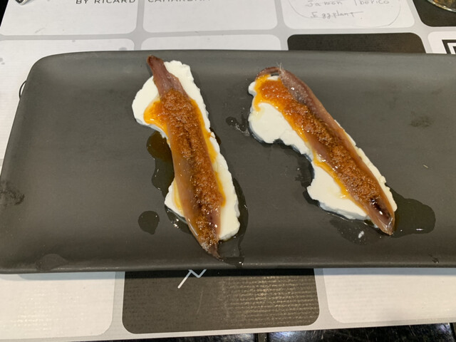 中央市場にもスターシェフカマレナのバー、11時過ぎでも数人の並び。席数多いのと、回転いいので数分で座れます。定番メニューはQRコードで読み取り、今日のメニューは黒板。定番オーダー、茄子のミソ醤油グリルはねっとり食感、イベリコハムはクリーミィ、アンチョビはフレッシュチーズと合いますね(๑˃̵ᴗ˂̵)