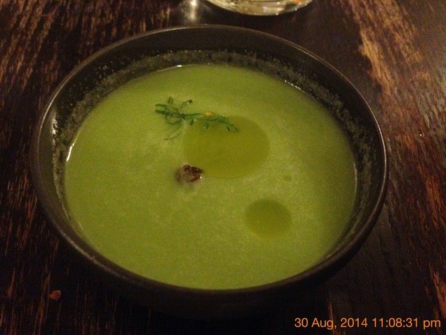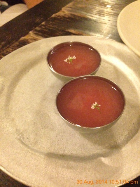 (先ほどガスパチョを頂いたばかりなのに、またスープ、という謎な構成。アボガド、キュウリ、レモングラス、と似たハーブを多用していました。ドライトマトがポイントになっていた一皿)
