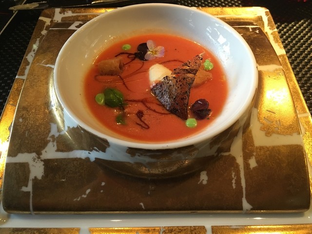 トマトのガスパチョ。マスタードを使ったシャーベットがのっています。