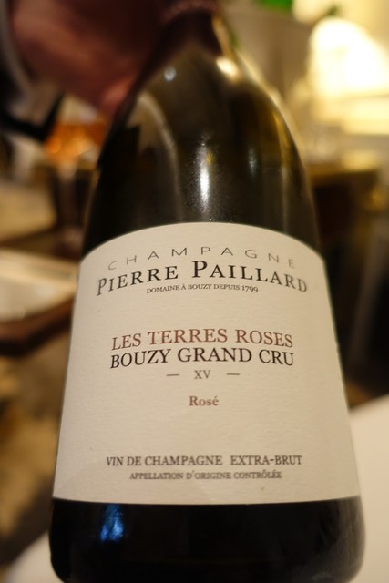 シャンパーニュのグラスは5〜6種の用意があり、見たことのないパイヤールのロゼを注文。サクランボのような香りに爽やかな口当たりが食前酒として最適。しかしながらお会計の明細で1杯39ユーロがついていたので軽く鼻血が出ました。