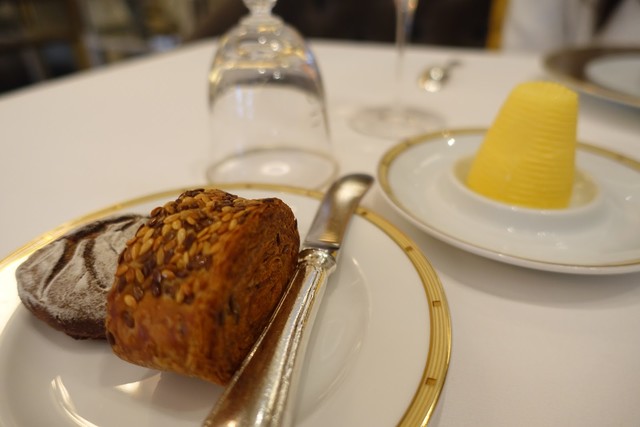 パンは3種。さすがはフランスの3ツ星、どのパンにも外さない旨さがあります。個人的にはプレーンなバゲットがお気に入り。写真奥の有塩バターをたっぷり塗って食べれば、それだけで立派な食事となり得るクオリティの高さでした。