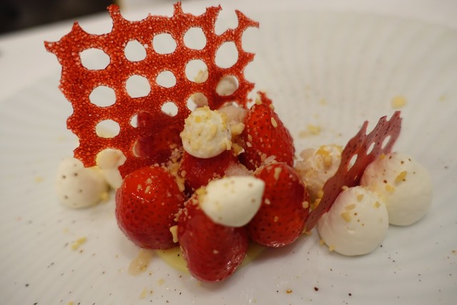 連れのデザートはイチゴ。ホワイトチョコレートで味を整えアクセントにリコリスを用いているとのこと。
