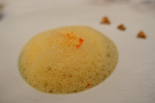 泡が覆いかぶさっていますが、中にはカニやロブスターなどの甲殻類のほぐし身と味噌などが詰まっています。これらの旨味には神秘的な深みがありますね。一本取られたと、思わず唸ってしまう美味しさでした。