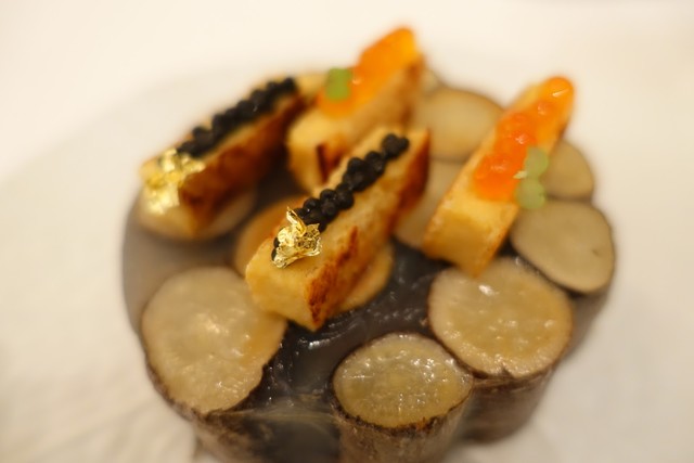 塩系ケーキの上に乗ったキャビアにイクラ(?)。シャンパーニュで乾杯するに最適な味覚です。ちなみにコチラも土台の部分は食べることができませんのでご注意を。