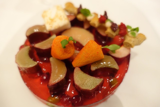 アミューズから美しいですね。人参風味の生地には爽快感あふれる酸味が詰まっています。塩系オカズ系のギモーブも試みとして面白く、奥のピッツァ的なポリポリも酒が進むスナック。ちなみに土台の派手な赤い部分とサツマイモっぽい箇所は飾りであり食べることができません。