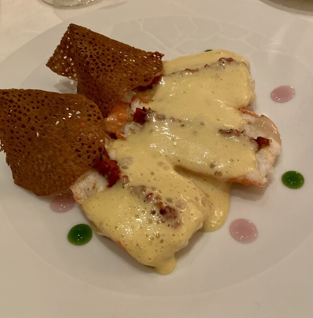 前菜として選んだラングスティーヌは、とても個性的だ。弾力感を強調することが多い素材だが、この店では弾力感より柔らかさをを重視している。添えたソースはマヨネーズを泡立てたもの。ラングスティーヌと合わせて、ふわりとした柔らかい食感を楽しませる。添えたウェファは一転してクリスピーな食感。