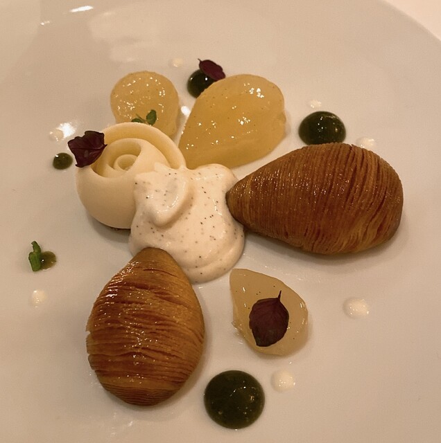 梨とアイスクリームのデセールは、なんとクロワッサンを添えている。食感の対比を楽しませる意図があろうが、これは理解するのが難しかった。