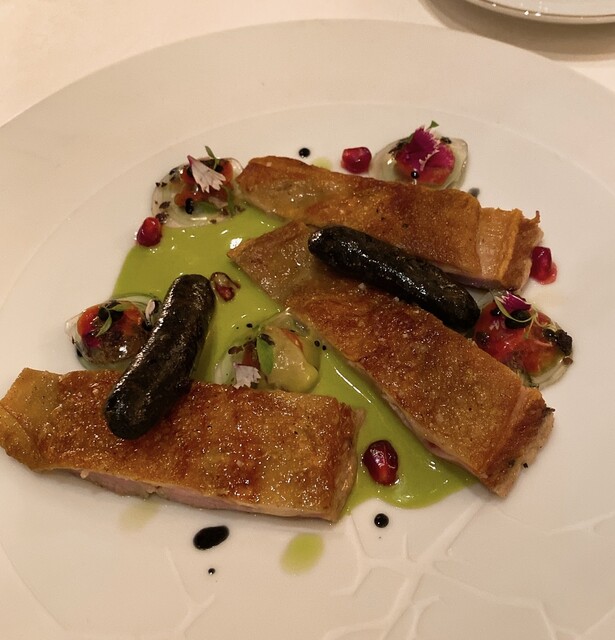 主菜の羊も個性的。皮をクリスピーに揚げるという余り見かけない調理法。身は柔らかい。皮と身はブラインドで食べたら鶏と思ってしまいそう。黒いソーセージのようなものが、二つ添えられている。これらは恐らく羊の内臓を素材としており、かなり野趣の溢れるものだ。同じ羊から、基本的には野趣を排した品と、敢えて野趣を全面に打ち出した品の両者を一皿に盛っている。