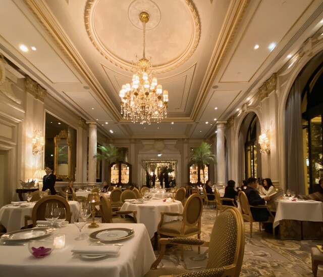 Le Cinqは、パリのFour Seasons George Vホテルのメイン ダイニングだ。高く白い天井。金色の装飾模様や鏡をあしらった内装。煌びやかなシャンデリア。大きな花瓶に生けられた花々。豪華かつ上品な素晴らしい内装だ。ホテルの中庭に面しているので、更に解放感がある。