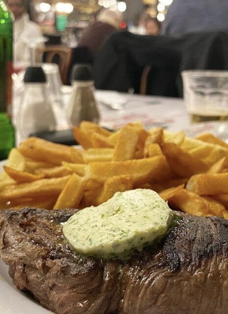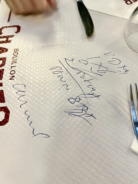 コスパ最高歴史ある大人気ブイヨン。毎晩30分待ちは覚悟の行列店です。ずらっと並ぶテーブルをキビキビ行き来するギャルソンが、長い腕に4枚もお皿を乗せる勇姿、オーダーをクロスに書き留めてチェックするテーブル。二人だと相席、お隣はチリとドイツのカップルで異邦人同士話も弾みます。活気ある下町の雰囲気ながら、どこかパリらしいエスプリの効いた楽しいディナーとなりました‼️