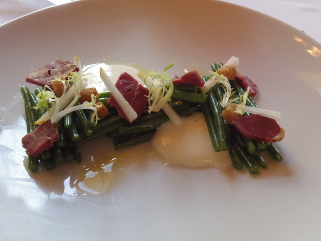 インゲンと鴨の胸肉の燻製に梨のエスプーマ。