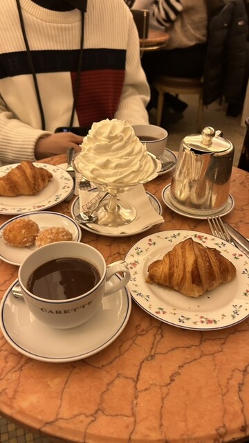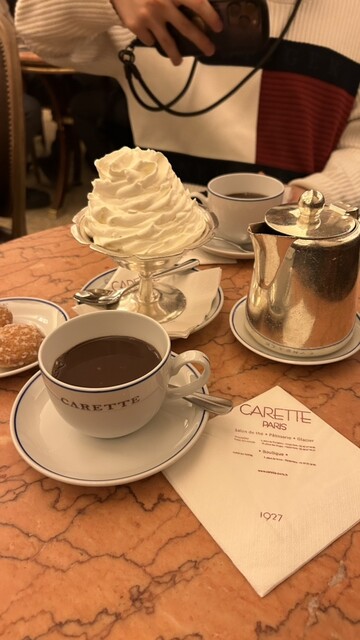 店内は満席状態でした。夕方でしたが、女性達が多い。人気のチョコレートカフェとスイーツを頼みました。沢山のメニューで迷いながら頼みました。テラスで食べるのもオシャレです。食べた後、エッフェル塔のイルミネ...