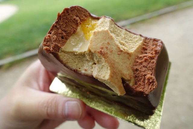 ご想像の通り割とややこしい味覚であるため、ホテルに戻って椅子とテーブルについて、フォークとナイフでじっくりと向き合って食べるべきケーキでした。今後、買ってすぐ公園で食べる方は、手づかみでパクパク食べることのできるものを選ぶと良いでしょう。