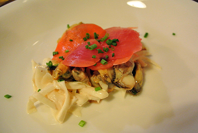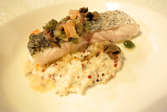 カリフラワーのクリーミーなスープは少し塩気が足りないけど、悪くないです。 アサリみたいな貝を軽く酢に合わせてセロリと赤カブと一緒にだされた料理は、ちょっと貝の生臭さが気になりました。 次のメルルーサは、パリッっと皮が中がしっとりと火入れされレモン風味の麦で一風変わっていましたが美味しかったでう。 次の雌鴨の黄金風も美味しかったです。 ピレネーのチーズのジャム添えと、クリームみたいなデザートで全部で6品です。