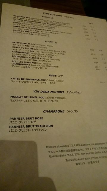 ディナーについては基本プリフィクスコースになっており、前菜とメインとデザートで€45ぐらいと、日本の標準的なフレンチレストランと価格は変わりません。また、ドリンクのメニュー及び価格は、掲載写真のとおりで、コース料理とワインを3杯飲んで1万円ぐらいでした。料理に関しては、盛り付けは美しいものの、味付けは古典的なフレンチ(悪い意味で)で、味の焦点が定まっていない印象。夜の治安を考慮すると、安全面での優位性は感じますが、はるばる日本から観光で訪れたのであれば、高価でも記憶に残るぐらい美味しいディナーを食べたいものです。