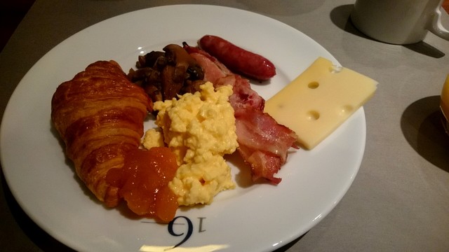朝食はビュッフェ形式で、入り口で受付を済ませ、テーブルに案内されるスタイル。以前は「カフェorティー?」と尋ねられ、飲み物だけ持ってきてくれましたが、今はセルフスタイルになった模様。料理の種類は、焼きたてのパン、ハム、チーズ、ソーセージ、スクランブルエッグ、ヨーグルトやフレッシュな野菜が用意され、ラインナップが豊富なのが驚きで、チーズもハムもヨーグルトも5種類前後は用意されていると思います。個人的にはソーセージとスクランブルエッグは必ずお皿に盛る料理。前者は、肉を噛みしめると味がじわじわ出てくるワイルドなタイプのソーセージ。後者はバターをふんだんに使用した香りのよい料理です。総じて乳製品の美味しさ、バラエティーの豊富さが日本のホテルの朝食とは異なるポイントかもしれません。