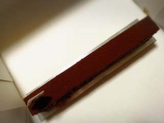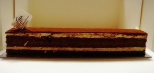 オペラ627円。こちらも細長~い見た目が印象的。美しい層の上にはココアパウダーがしっとりと降っています。コーヒーを染みこませた生地がまるでティラミス。