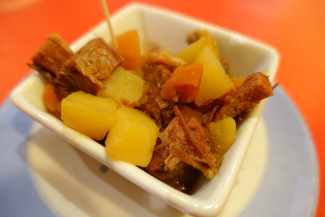 お通しの煮込み(?)。牛肉・人参・ジャガイモなど。家庭的で悪くないのですが、後の料理と味覚が丸かぶりなので、誰か注意してあげたほうが良いと思います。