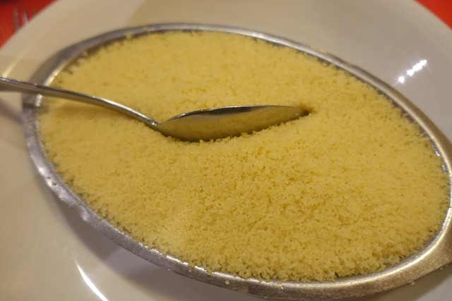 主題のクスクス。「世界最小のパスタ」とも呼ばれており、硬質小麦であるデュラム小麦が原料の粒状パスタです。フランス料理であればタブレ(サラダに用いてドレッシングつぶつぶなやつ)として頂くことが多いですが、これ単体で接すると迫力があります。先の煮込みと半ば混ぜ混ぜしながらカレーのように頂きます。