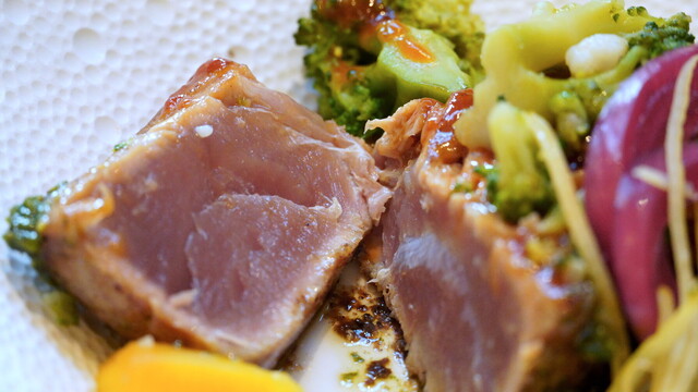 ●Thon roti a la plancha , legumes de saison , sauce tataki 22€