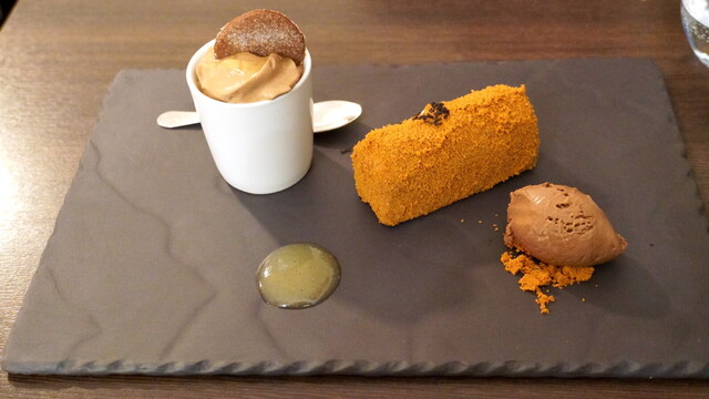 洋梨のコンポート、ソルベ、ジュレ、キャラメルのアイス、ムース…