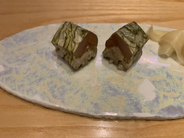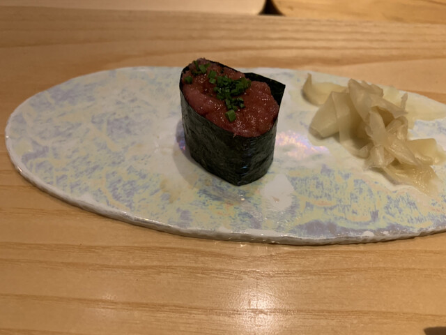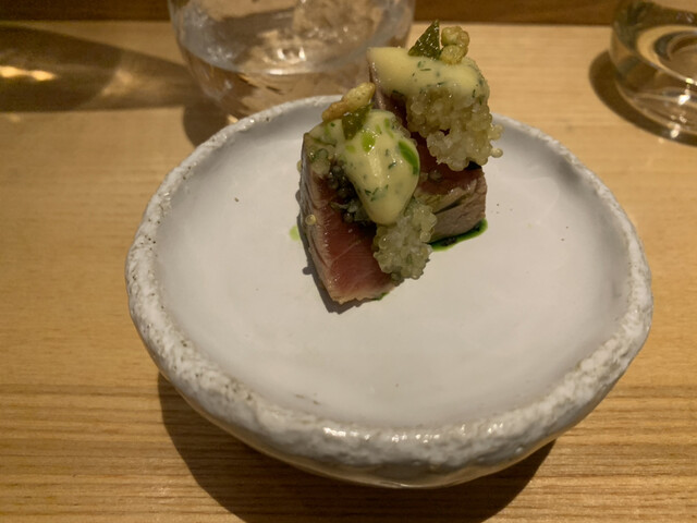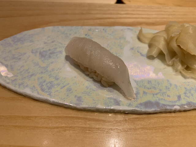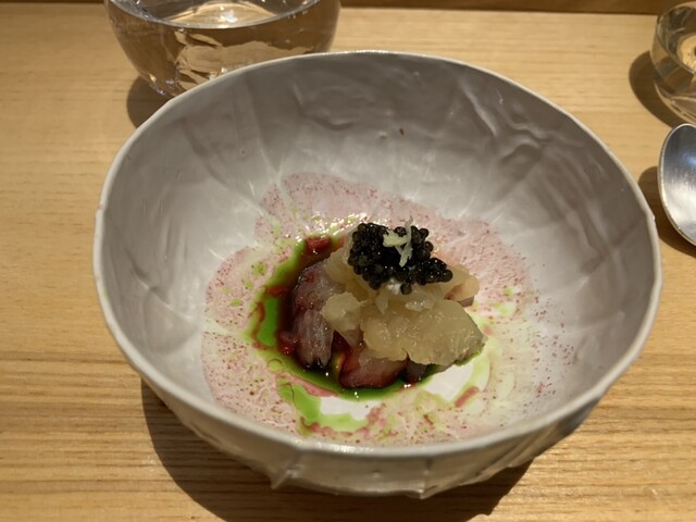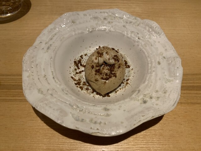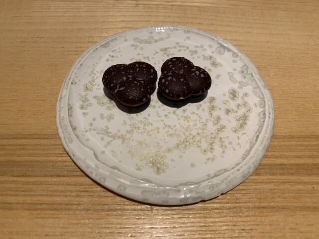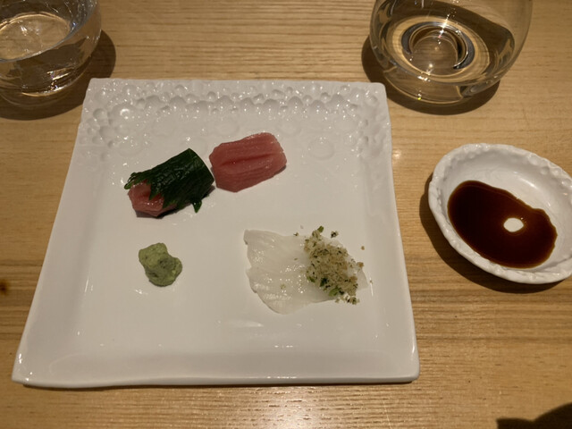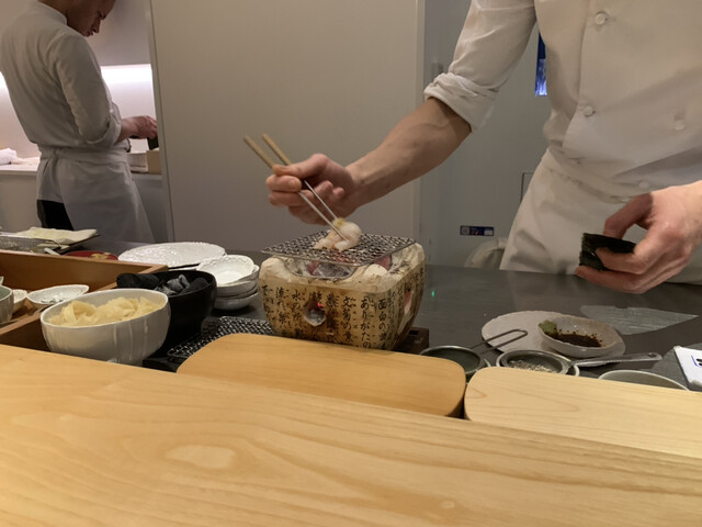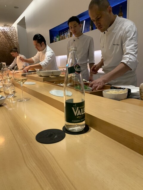 プチパレ近くの2つ星鮨店、スターシェフ、ヤニック・アレノ傘下のお店。日本酒は九平次・Iwa・日日・作がグラスもしくはポットでありますが、ロワーヌ山田錦の仏産日本酒チョイス。テイスト御神酒っぽいですが、悪くないです。お店は2018年に開店してすぐ星付、ほどなく2つ星になってます。サカナはイカとハマチのみ日本から。それ以外はEU産、最初のマトウ鯛とウニはダメですが、とろみあるサカナとシャリはなかなかです。デザート数点、フランスらしいところ、テーブル席含め満席(๑˃̵ᴗ˂̵)