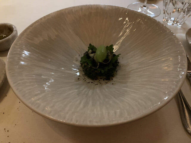 パレ・ロワイヤル中庭に面した2つ星レストラン、ギリシア人シェフでお料理フレンチとギリシア風、集客少なめなのか以前はなかったアラカルトメニューも載せられて3択。口コミ評判よろしいギリシア風のコースチョイス、記載ワインペアリングは7杯とメトロで帰るには多いので、白赤1杯ずつ自分で選びます。白はサントリーニ島土着アシルティコ使った流行りのギリシア産Skitali。シャブリプルミエより5割高!飲むと納得、日本で見かけるドメーヌシガラスより力強さ5割増し、赤はアルザスのマルセルダイス。お料理は手間かけて頑張ってはいます。全員スニーカーのサービス陣も好印象(๑˃̵ᴗ˂̵)なおBGMは80‘っぽいのですが、日本のシティポップも流れてびっくり。欧米で再評価を実感。