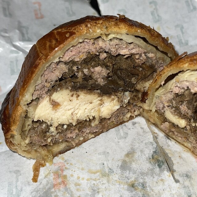 料理は『パイ包み焼き”専門店ですね。一人前をパイ生地で包んで焼き上げた、立派なフレンチ。皿に盛れば立派なメインディッシュになります。しかし食べ方は、別料金で付けられる肉汁ソースをかけて齧り付きます。