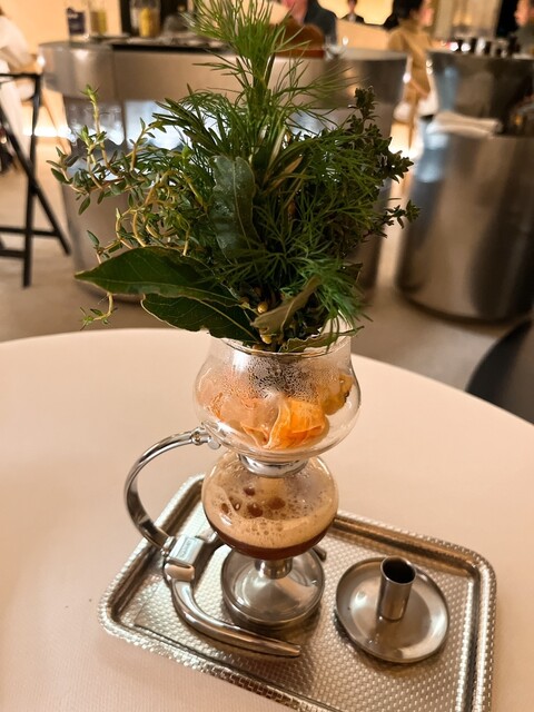 テーブル上でラングスティーヌとラビオリのコンソメソースを温めて野菜のエキスを抽出するプレゼンテーション。