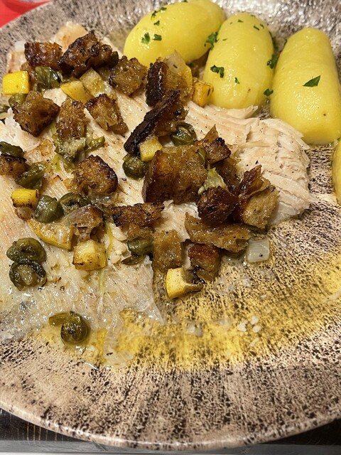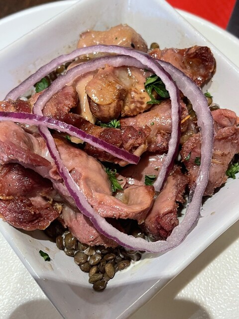 今回は砂肝とレンティルの暖かいサラダを前菜に、エイのグルノーブル風をメインにして、デザートもコーヒーもパス。
