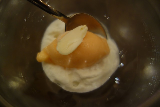 デザート1皿目はメロンのアイスにアーモンドのムース(?)。メロンのコクが濃く、メロンよりもメロンの味がします。