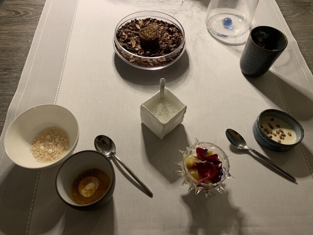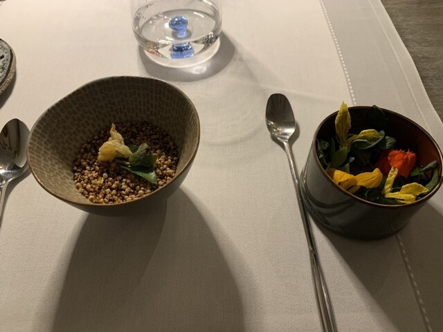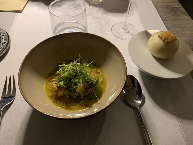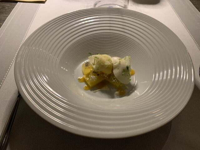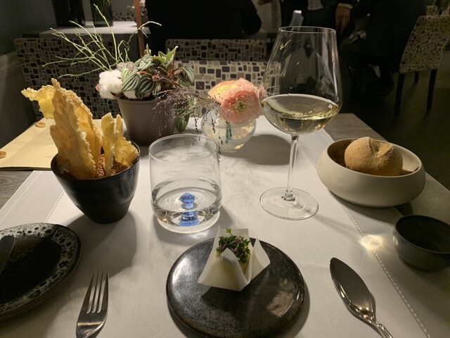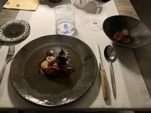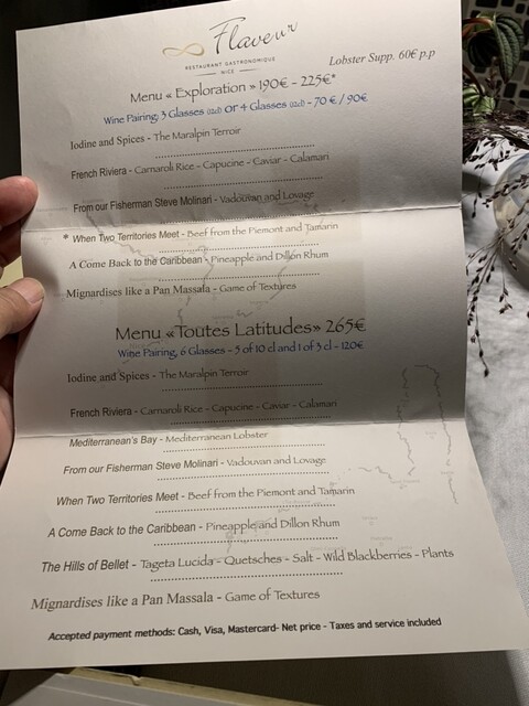 ニース街中の2つ星で土曜ディナー、小ぶりな店内、響く会話、カップルばかりで皆さんトーン抑えめで静かです。サービスは黒服の女性2人、快適なサービス。お料理は少な目コースに追加のミーツ。加えて一番少ないワインペアリング3種、なにしろ一杯120ml表示ですから\(//∇//)\ 満席のせいか お料理提供スピード遅くて眠っ、前菜3セットで2時間、時々寝落ち、お味はアジアンフレイバーありでまずまず、お料理手が込んでいるので、短いメニューでも19時半スタート、午前0時オーバー( ̄▽ ̄;)