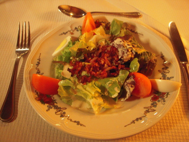 ここでは、ツアー用の食事で、前菜にサラダ、メインがシュークルト、デザートがクリーム・キャラメル(プリン)でした。