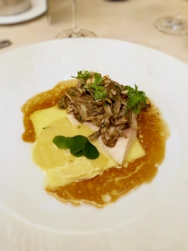 天火焼きしたポレンタ、ハナビラタケ、オランデーヌソースとオクサリス