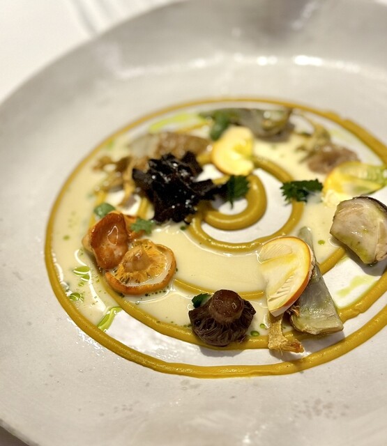 ぐるりとアーティチョークのソースを敷き詰め、その絨毯の上には様々なキノコ♪
