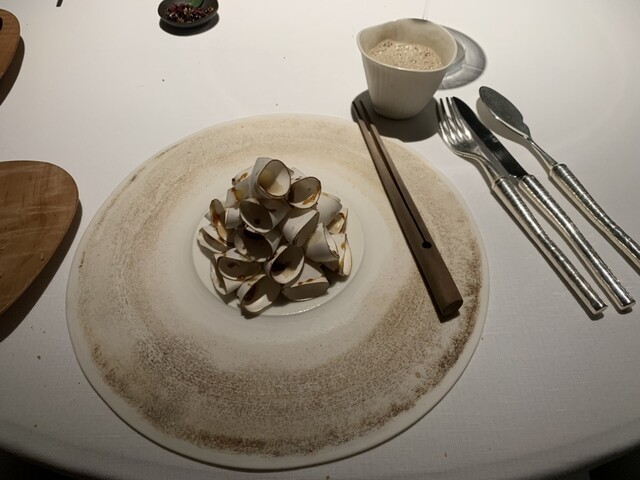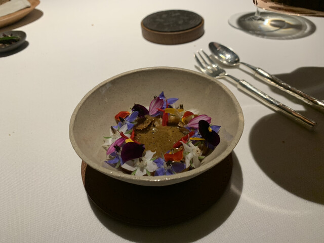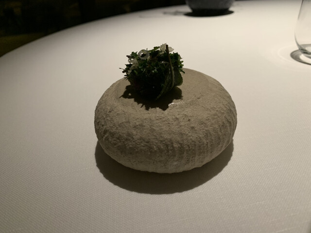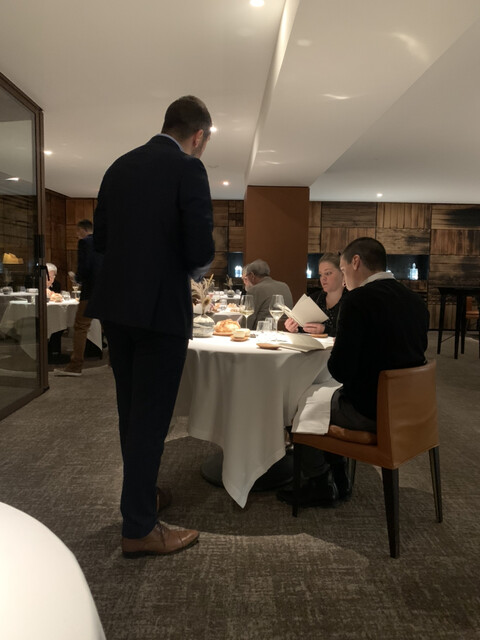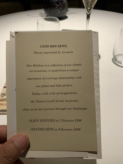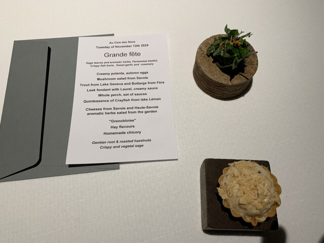 アヌシー駅前からバスも出てますが、歩いても50分弱の高台、ミシュラン3つ星かつグリーンスター取得の異色レストラン。近在の食材メインってことで、野菜・きのこ類と湖の魚のみ、肉は扱わないです。メニューは白紙でお楽しみ。ワインリストは周辺地域とフランス全体に冊子分かれて白ばかりで、主に廉価な周辺地域ワインを提供です。お料理はまずまず、シックな内装、サービスがすばらしい。平日火曜、半分くらいの入り。この時期アルプスエリアは、予約取りやすいです(//∇//)