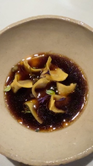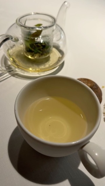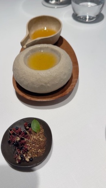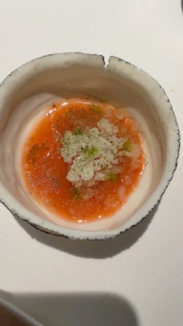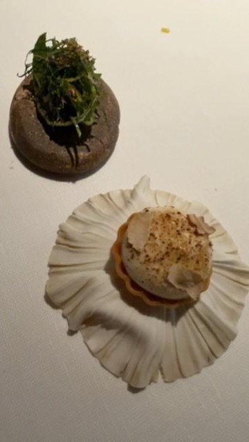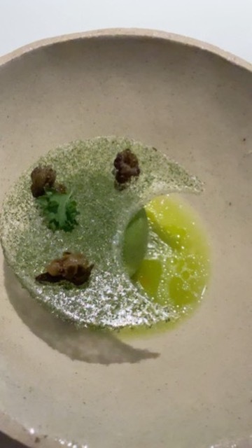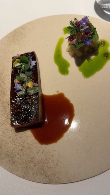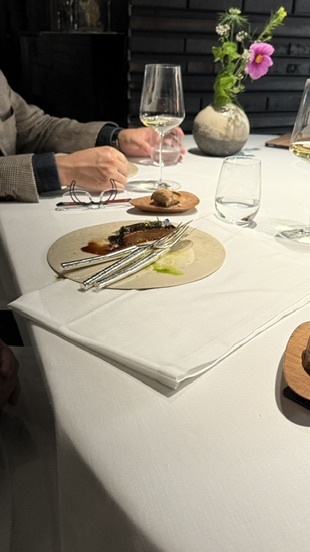 魚の低温調理!! ナイフで切ると身質が崩れてベタっとなる。オープンで少し焼いて水分抜くと良いのに。皮はプレスして低温調理だからネトっとしている。臭みは感じないから良い素材なんだと思う。Mさん8割残し、Oさん3割残し。